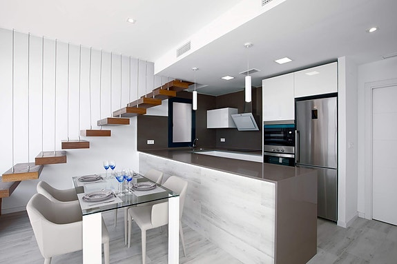 På en av de flotteste utsiktstomtene i Lomas de Cabo Roig har vi disse lekre eneboligene med store vindusflater og delvis dobbel takhøyde.