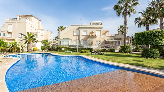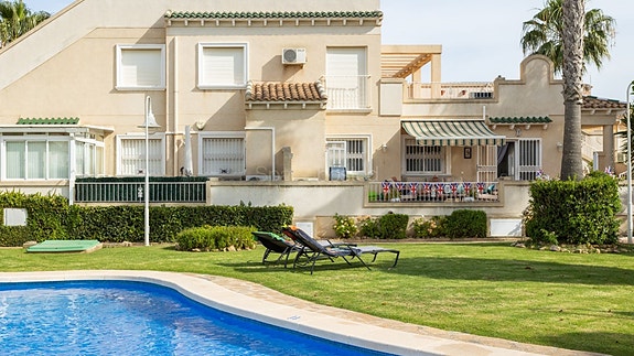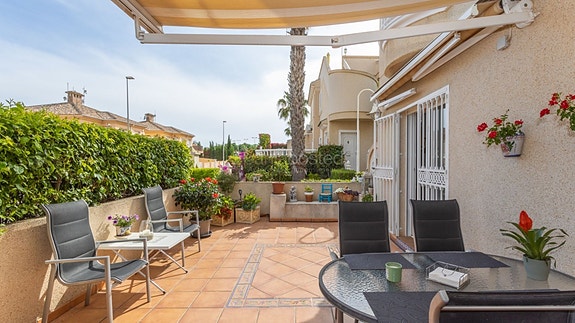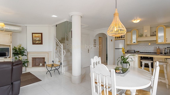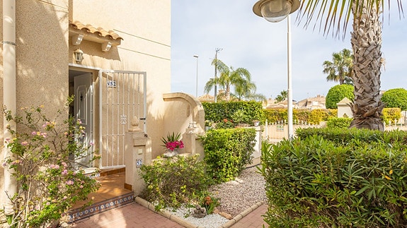 Vi er glade for å kunne presentere dette flotte rekkehuset i Miraflores 5. Et særdeles pent lukket anlegg med flotte grøntområder og to delikate bassengområder. Dette er en skjult perle og det er svært sjelden det kommer gode boliger til salgs i dette annleget. Rekkehuset ligger på et hjørne, og har i første etasje en romslig stue og stort kjøkken, 1 soverom, 1 bad og en liten bod. Det er direkte utgang til en stor sørvendt terrasse med god plass til både sofagruppe, spisebord og grillområde. Terrassen er godt skjermet uten innsyn.