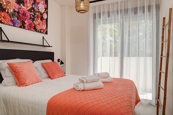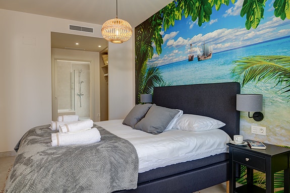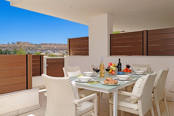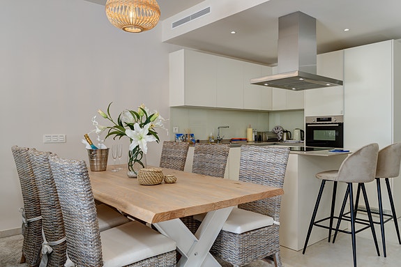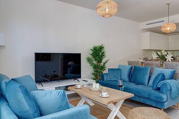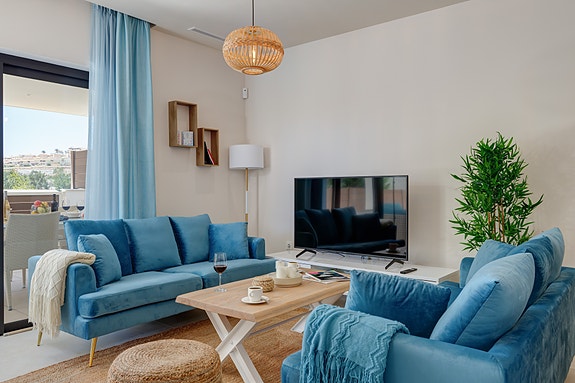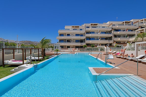 Denne moderne leiligheten ligger i boligkomplekset JARDINANA LOTUS i La Cala de Mijas, kun 5 minutter spasertur til strand og alle fasiliteter. Denne koselige byen ligger midt mellom Malaga og Marbella og er kjent for et stort utvalg av restauranter, og for den 7 km lange strandpromenaden. Her kan du velge mellom spanske chiringuitos og de litt mer luksuriøse strandklubbene. La Cala er en liten, intim by med hyggelig og avslappende atmosfære, et perfekt feriested for barnefamilier og voksne. Dette området er også et paradis for golfentusiaster. La Noria Golf ligger sentralt i La Cala, bare få minutter unna ligger Calanova Golf, La Cala Golf og den velkjente Chaparral Golf.Avstander