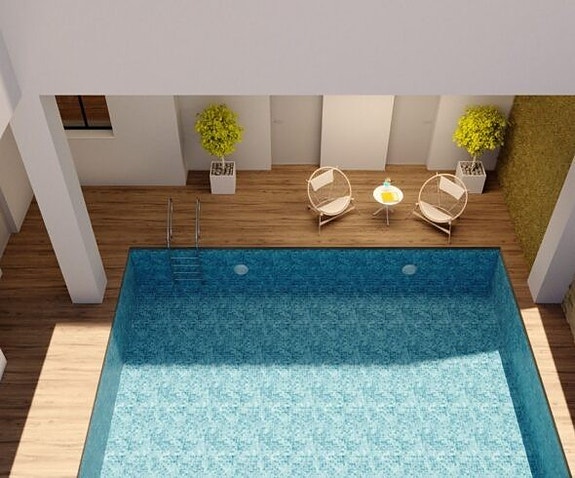 Fellesområde med basseng.*Prisen i annonsen gjelder toppleilighet med 2 soverom