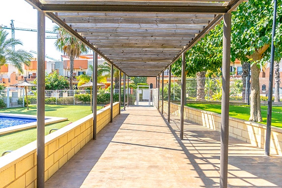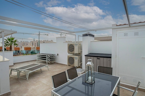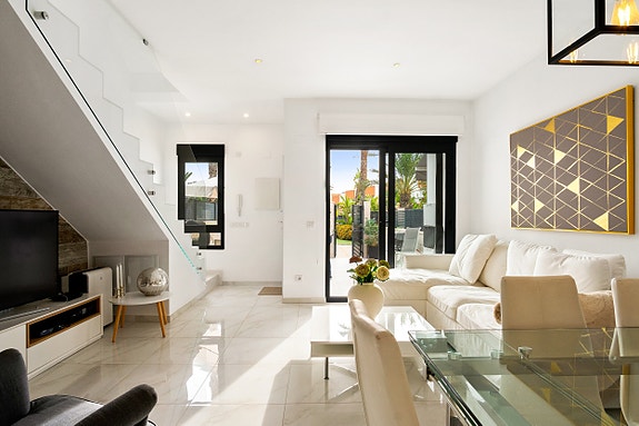 Nyere flott rekkehus i det populære området "El Barranco" som ligger bare minutter å gå fra Playa Flamenca. Gangavstand til et stort utvalg av restauranter, matbutikk, idrettsanlegg, lørdagsmarked, kjøpesenteret "Zenia Boulevard" etc. Stranden sykler man til på cirka 15 minutter. Ellers flere 18-hulls golfbaner innenfor noen få kilometer.