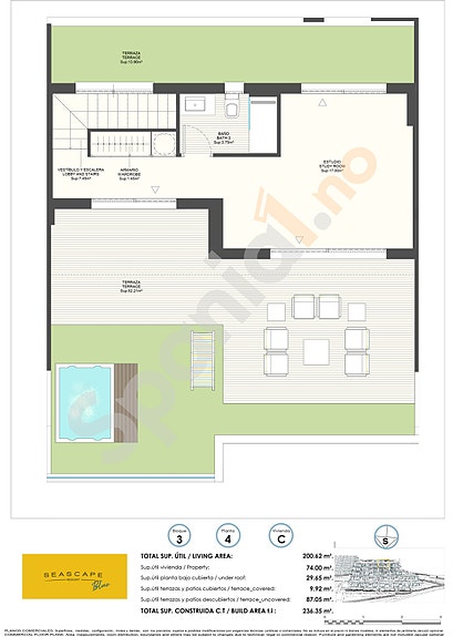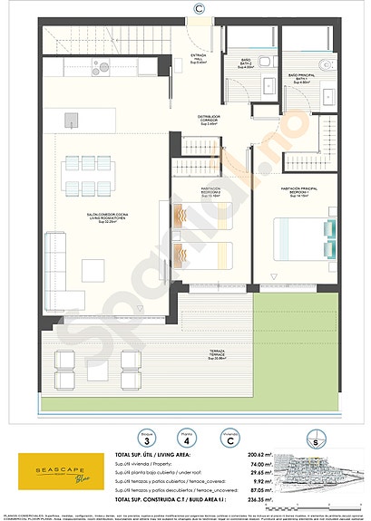 Komplekset består av duplekser, leiligheter, toppleiligheter og uavhengige villaer fordelt på 3 blokker med leiligheter med 2 og 3 soverom, 2 bad, åpen kjøkkenløsning med stue, innebygde garderober, terrasse. Parkeringsplass og bod i underetasjen. Lukket kompleks med fellesområder, utsikt over havet og Benidorm skyline, kun få kilometer fra det yrende strandlivet, kjøpesenteret og sandstrendene.