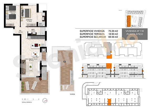 Boligkomplekset består av 106 leiligheter med store terrasser. 104 leiligheter med 2 soverom og 2 bad, og 2 toppleiligheter med 3 soverom og 2 bad.
