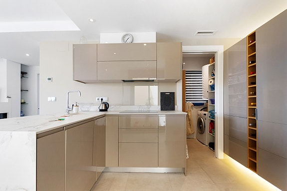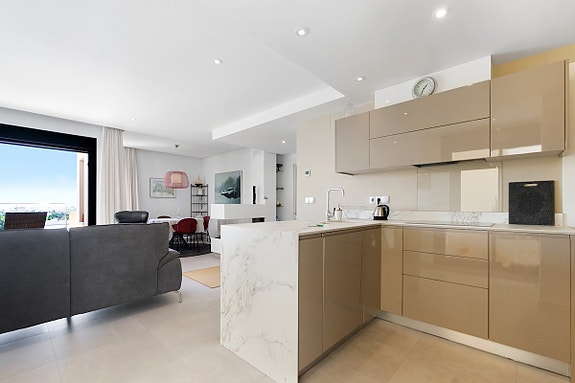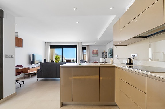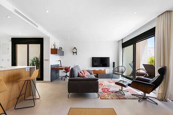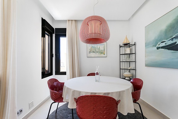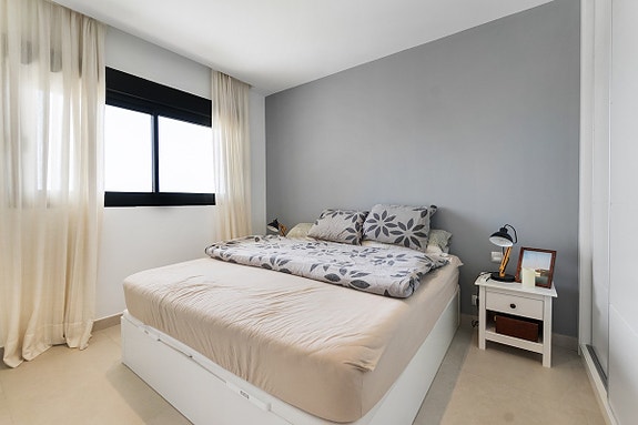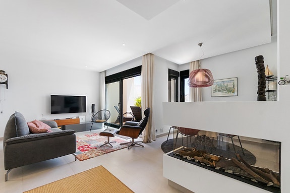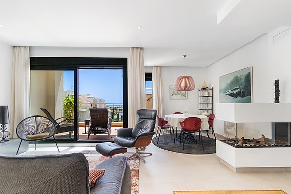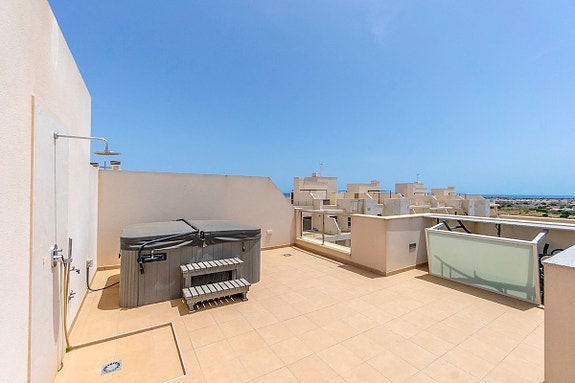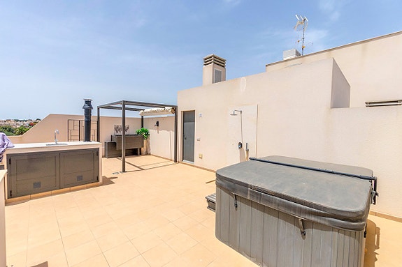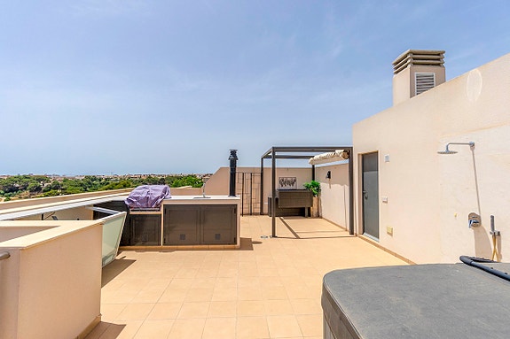 Vi er glade for å presentere denne unike penthouse leiligheten beliggende i det populære og sjarmerende området Los Dolses. Eieren av leiligheten, som bor der alene, gjorde om leiligheten fra en penthouse med 2 soverom til en penthouse med 1 romslig soverom med god garderobeplass, samt romslig stue med gasspeis. Soverom nummer 2 er per i dag spisestuen, hvilket er enkelt å konvertere tilbake til den opprinnelige planløsningen hvor denne plassen var et soverom. Det finnes også en gjesteleilighet i dette leilighetskomplekset, som kun kan brukes av venner/familie av eierne som har leilighet her. Leiligheten har utsikt både til sjøen og til fellesområde med japanske hager og flere svømmebasseng (hvorav det ene er oppvarmet). Fellesområdet har også solsenger som kan benyttes av eierne, samt en liten lekeplass for barn.