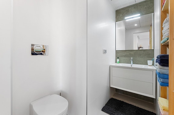 Leiligheten har rikelig med ekstrautstyr og den selges blant annet med hvitevarer, A/C, LED belysning, elektriske persienner. gasspeis, gulvvarme på begge bad, parkering og to romslige boder inkludert i prisen. Utenfor stuen, via store skyvedører, har du en flott terrasse med full oversikt over fellesområdet. Videre fra terrassen fører trappen opp til den private takterrassen hvor du har panoramautsikt.