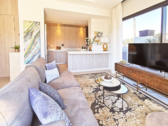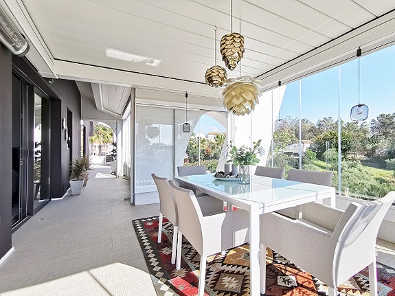 Denne luksuriøse toppleiligheten ligger i boligkomplekset Dunes Beach Marbella, med gåavstand til strand, restauranter og den vakre båthavnen i Cabopino.