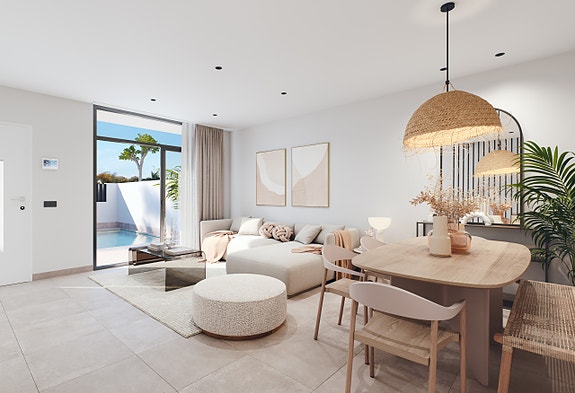 Moderne rekkehus med 3 soverom i San Pedro med kort gangavstand til fasiliteter. Eget basseng og takterrasse. Utbygging bestående av 18 rekkehus beliggende i sjarmerende San Pedro del Pinatar. Husene ligger etablert og rolig boligområde, nære både restauranter og butikker, stranden og sportsenter. Boligene med 3 soverom og 2 bad. Moderne med åpne løsninger. Privat basseng, terrasse,parkeringsplass, romslig takterrasse og hage hvor du kan nyte solen hele året.