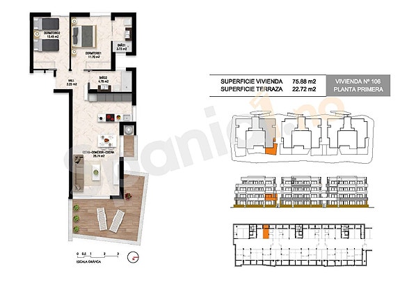 Boligkomplekset består av 106 leiligheter med store terrasser. 104 leiligheter med 2 soverom og 2 bad, og 2 toppleiligheter med 3 soverom og 2 bad.