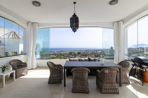 Denne luksuriøse villaen ligger i et rolige området i Elviria og har den mest spektakulære utsikten du kan forestille deg. Kun 2 kilometer fra stranden!. Elviria har vært lenge et populært feriested og ligger bare noen få kilometer øst for Marbellas sentrum med noen av de beste strendene på Costa del Sol, sammen med de beste strandklubbene, som Nikki Beach. Elviria har tre internasjonale privatskoler og tre populære golfbaner. Nærhet til populært kjøpesenter med aktivitet hele året og som tilbyr et bredt utvalg av internasjonale restauranter., kun 1,5 km unna.- 2 km til stranden