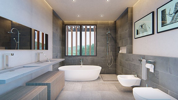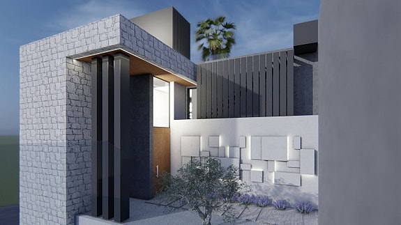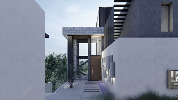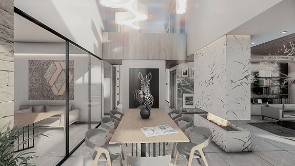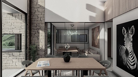- På inngangsnivået, som har heis som når alle etasjene, finner du stue med skyvedører som kan foldes tilbake i veggene, spisestue, kjøkken, vaskerom og stor terrasse som leder til hovedbassenget og hagen.