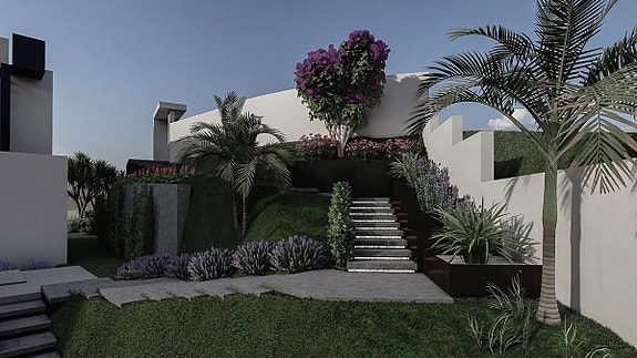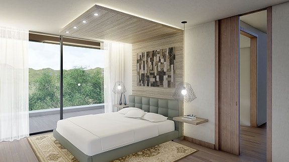 - Øverste nivå har tre soverom som deler en terrasse til høyre, og et hovedsoverom med eget bad, garderobe og dusj til venstre. Utsikten omfatter golfbanen, innsjøen og havutsikt.