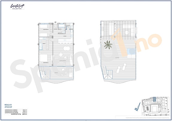 Penthouse-leilighet med 2 soverom, og med terrasser på 136m2.De første boligene ligger i små intime bygninger fordelt på to og tre etasjer, som kombinerer privatliv med en perfekt beliggenhet i harmoni med de vakre omgivelsene.