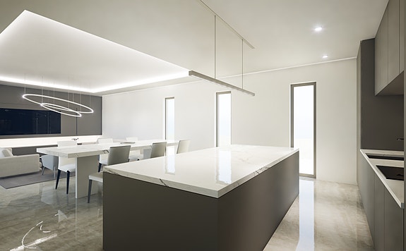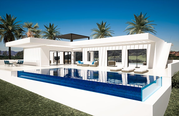 Villaen har en takterrasse og tilbyr mange valgfrie tillegg å velge mellom, for eksempel et utendørs kjøkken, pergola, boblebad og avslapningsområde med solarium og dusj.