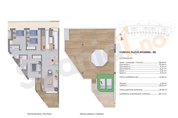 - Toppleilighet med takterrasse, 2 soverom, 2 bad fra 218.900 euro