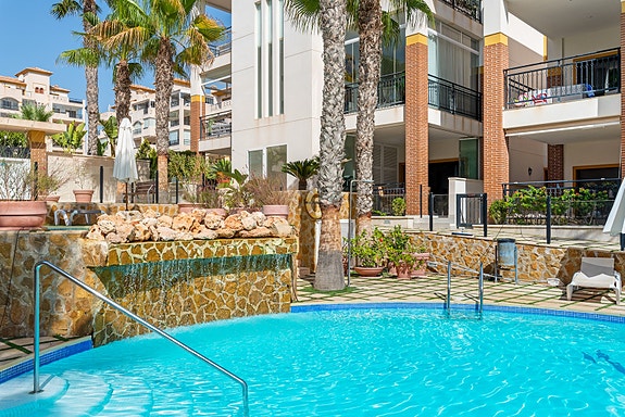 Velkommen til Marjal Beach, et unikt og eksklusivt boligkompleks kun 850 meter fra de hvite sandstrendene i Guardamar. Leiligheten i seg selv er romslig på 110 m2, og inneholder tre soverom og to bad samt to terrasser. Utbygger, er en av de mest anerkjente langs kysten og er kjent for å holde en høy standard. Det er elektriske persienner i hele boligen koblet til et smarthus-system og varmekabler på begge bad. Leiligheten har tilgang til et delikat fellesområde med basseng, grøntområder og fossefall, samt en spa avdeling i etasjen under. Der finnes det et oppvarmet basseng, treningsrom og sauna. Det følger også med parkeringsplass i underetasje samt en bod.