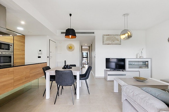 Luksuriøs leilighet med svært etterspurt beliggenhet i Los Dolces i La Zenia. La Zenia er et veletablert og meget attraktivt boligområde i kystkommunen Orihuela Costa, som ligger 5 km sør for Torrevieja og 50 km fra Alicante flyplass. Her bor man med kort gangavstand til stort sett alle tenkelige fasiliteter. Det er matbutikker, restauranter og kafeer “rett utenfor døren” og man finner et av Spanias største utendørs kjøpesentre (Zenia Boulevard) like i nærheten. Området er ellers kjent for sine kritthvite sandstrender med “blå flagg” stempel, som er en indikasjon på blant annet høy vannkvalitet. For deg som ser etter et sted som passer alle i familien, er dette stedet helt ypperlig. Stranden ligger kun 15 minutter unna med sykkel. I området er det også mange fine sykkelmuligheter, og like ved leiligheten ligger den berømte "kanalen" hvor du kan sykle milesvis i uforstyrret i fantastisk landskap.Avstand