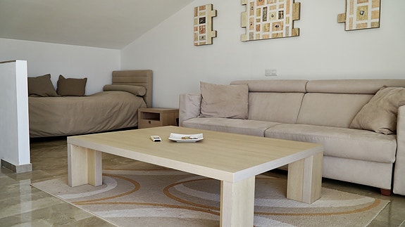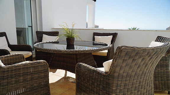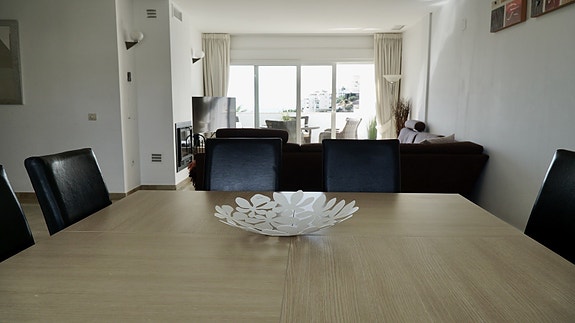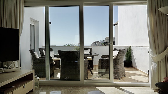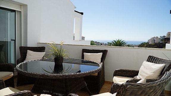Denne flotte penthouseleiligheten ligger i det populære Miraflores/Riviera del Sol-området, og er lys og gjennomgående med store vinduer og terrasser både foran og bak. Leiligheten er stor og med en meget gjennomtenkt planløsning. Det er utsikt utover golfbanen til sjøen og til fjellet. På toppen av leiligheten er det fantastisk panoramautsikt.