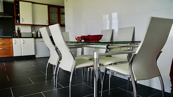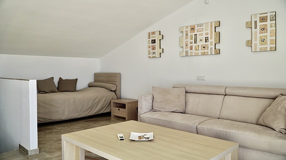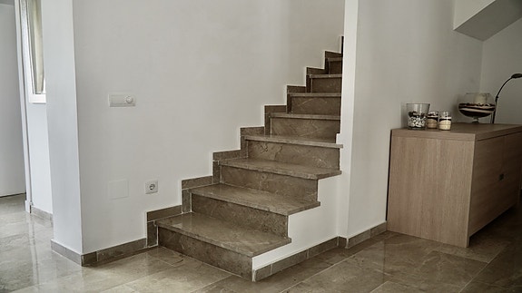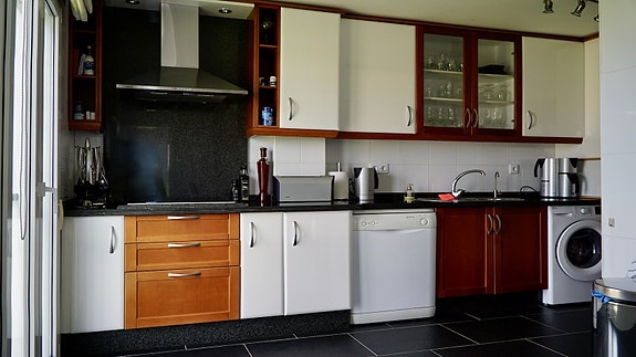 Leilighetens hovedetasje består av en stor stue med peis og spisestue med plass til 8 personer, 3 soverom, 2 bad, separat gjestetoalett og et fullt utstyrt kjøkken. Det er montert egen kran på kjøkkenet med filtrert drikkevann.Det romslige kjøkkenet har arbeidsflater i granitt og inkluderer et stort kjøleskap/fryser, innebygd stekeovn, mikrobølgeovn, keramisk platetopp, oppvaskmaskin og vaskemaskin. Det er et eget frokostområde med bord og stoler.