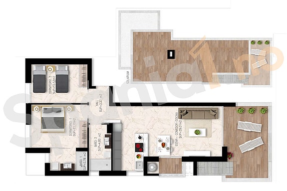 Toppleilighet med 2 soverom og 2 bad, stor terrasse/takterasse. Pris fra 259.000€