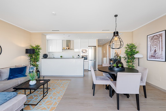 Stuen er smakfullt innredet og møblert med materialer av høy kvalitet. Dobbeltrom med eget bad, dobbeltrom og enkeltrom har begge garderober.En av de fremtredende funksjonene til denne penthouseleiligheten er takterrassen, som tilbyr et eksklusivt uterom for nytelse og avslapning. Det er et perfekt sted for å sole seg, arrangere sammenkomster eller bare sette pris på utsikten over havet og fellesområdene.