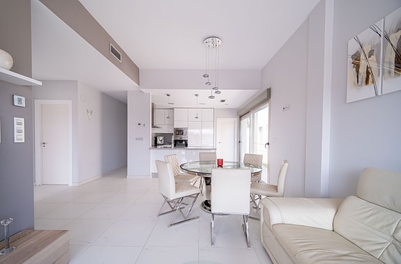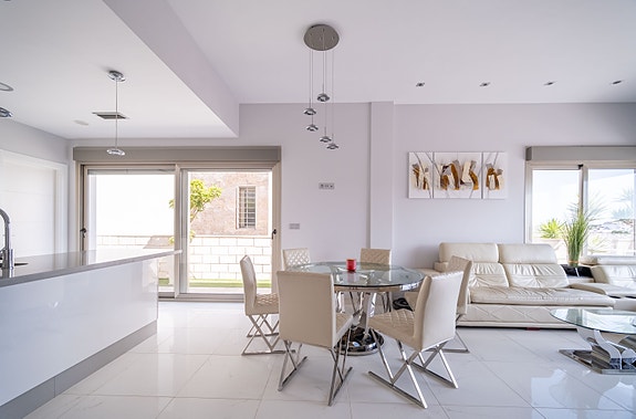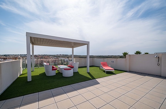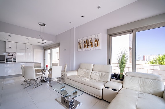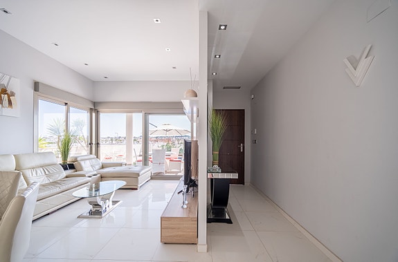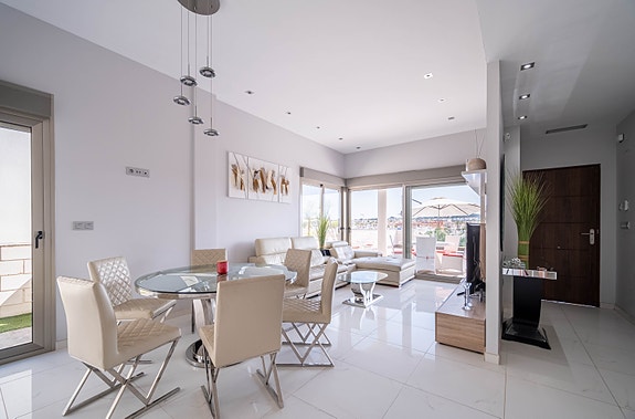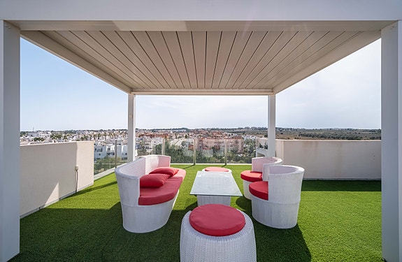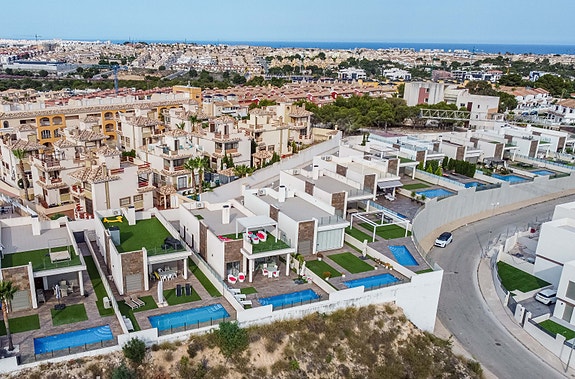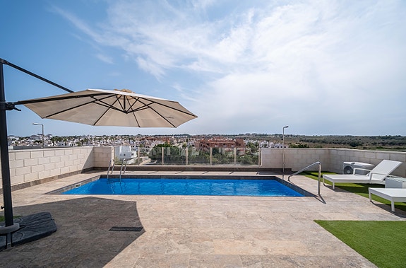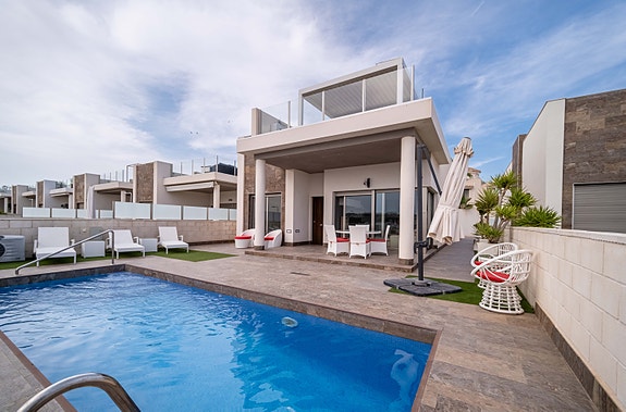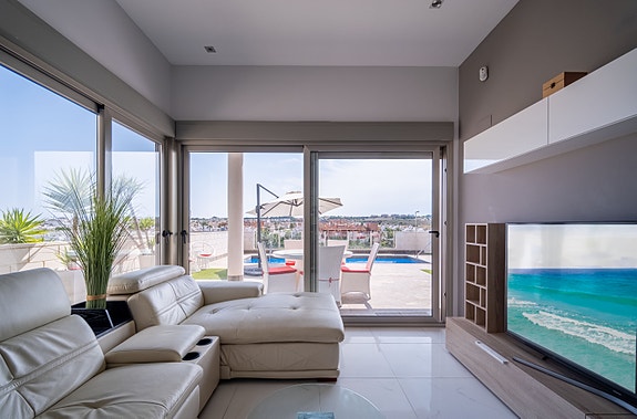 Denne villaen har høy standard og tilbyr den perfekte miks av komfort og luksus. Villaen inneholder fire romslige soverom med innebygde garderober, tre moderne bad (hvorav 2 har eget bad), stue med åpent kjøkken hvor det er direkte tilgang fra stuen og ut til bassengområdet via store skyvedører. Det er stor uteplass som gir rom til både spisegruppe, solsenger og loungeområde. Det er også varmepumpe til bassenget, slik at man kan ha behagelig badetemperatur året rundt. Det er gulvvarme på badene, elektriske persienner i hele huset, air condition, hvitevarer etc. I tillegg har huset en fantastisk takterrasse med utsikt over Villamartin og naturskjønne omgivelser, noe som gjør det til et ideelt sted for å nyte solnedgangen. Området er kjent for sine flotte turveier, flere 18-hulls golfbaner, samt Villamartin Plaza som er sentrumet av Villamartin - her yrer det av liv med de mange restaurantene og barene som finnes. Ellers er det 6-7 min å kjøre til de mange flotte sandstrendene.