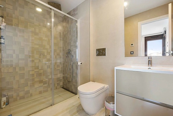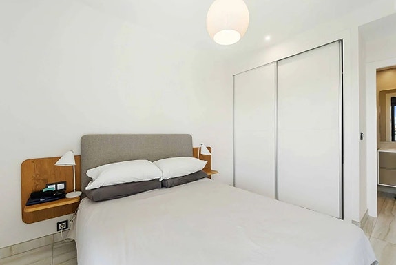 Nydelig toppleilighet med stor sørvendt balkong mot bassenget og privat takterrasse med fantastisk utsikt over Middelhavet.