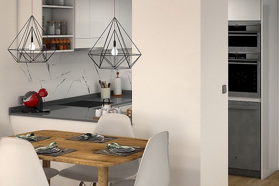 Leilighetene har delvis åpne stue- og kjøkkenområder, to soverom med innebygde garderober og eget bad i hovedsoverommet.