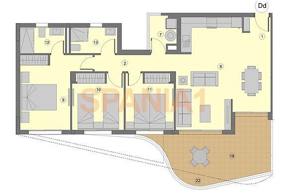 Spania1 har gleden av å presentere totalt 36 leiligheter med 2 og 3 soverom med 2 bad og med ekstraordinær havutsikt fra de fleste leilighetene. Fellesarealene vil bli plassert på takterrassen, et ideelt sted å nyte den beste soloppgangen eller solnedgangen takket være dens 360º utsikt.
