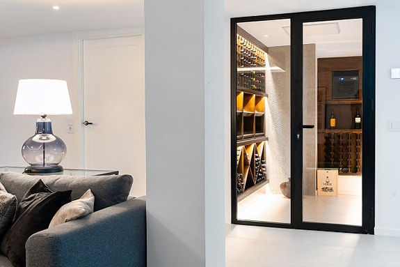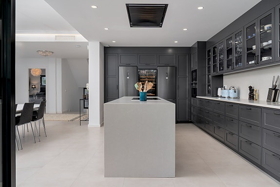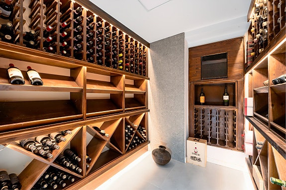 Den kulinariske opplevelsen heves med et eksklusivt kjøkken, og for vinentusiaster venter en temperaturkontrollert vinkjeller i en ferdig dekorert kjeller.