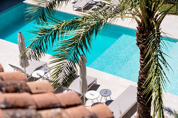 Uteområdet er helt unikt med en vakkert anlagt hage med et stort privat oppvarmet basseng - din personlige oase for avslapning eller underholdning. Takterrassen er også perfekt for hyggelige sammenkomster eller bare å nyte panoramautsikten over golfbanen.