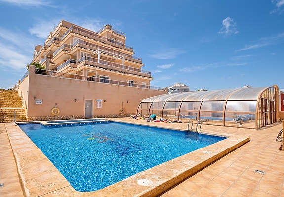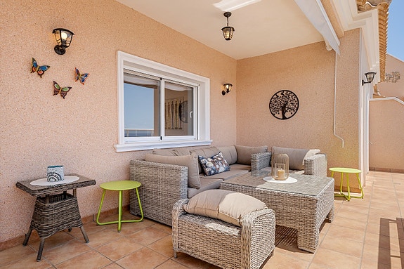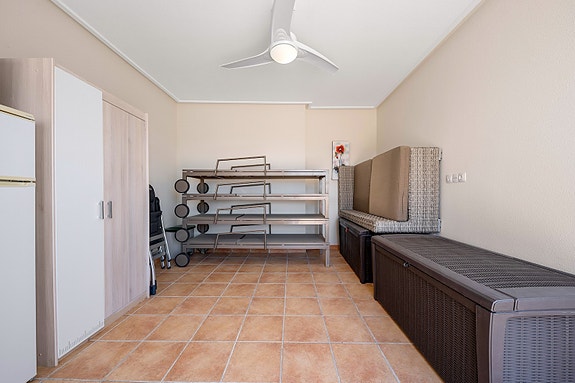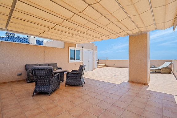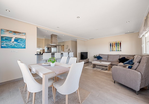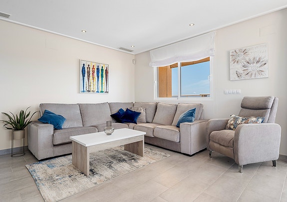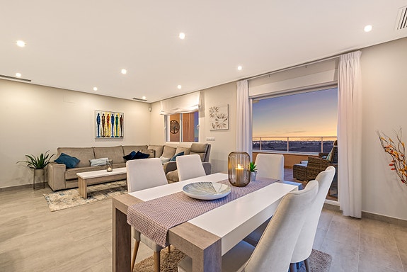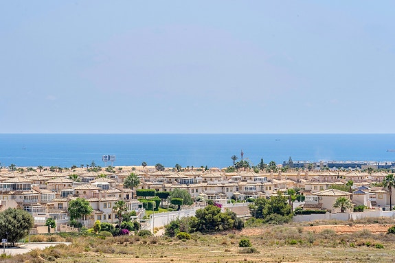 Utelivet kan nytes på en skjermet terrasse med nydelig utsikt og gode solforhold da leiligheten er sørvendt. Boligen ligger i et av de mest attraktive områdene i Villamartin, og har blant annet panoramautsikt over det omkringliggende landskapet, og Middelhavet.Når du går inn i leiligheten kommer du til et inngangsparti med garderobe og skohylle, deretter blir du møtt av en romslig stue og allerede her ser man utsikt mot havet.