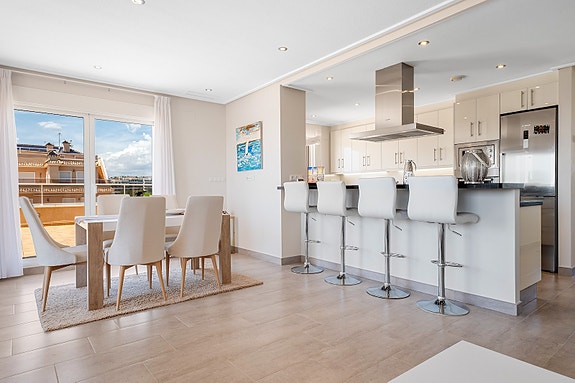 Et av høydepunktene til denne leiligheten er uten tvil dens vidstrakte terrasser, tilgjengelig fra både stue, spisestue, hovedsoverom og kjøkkenet.