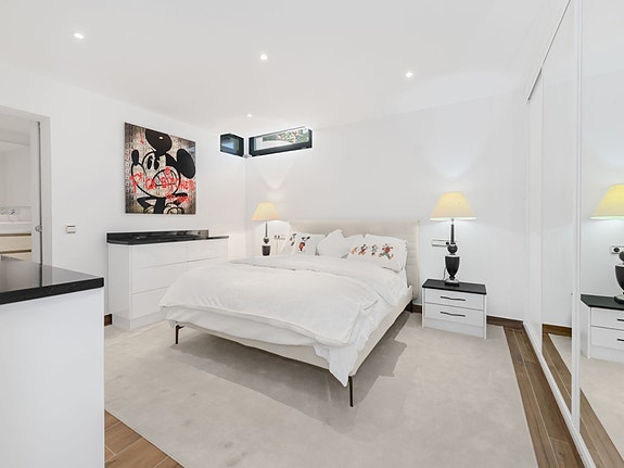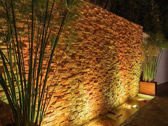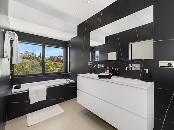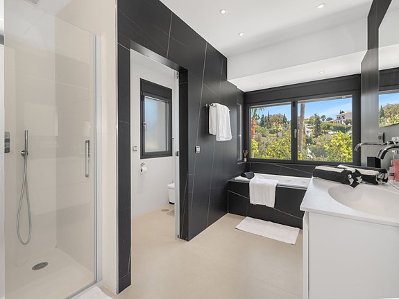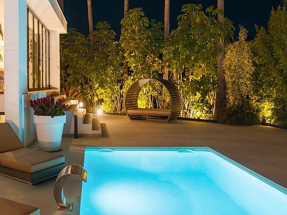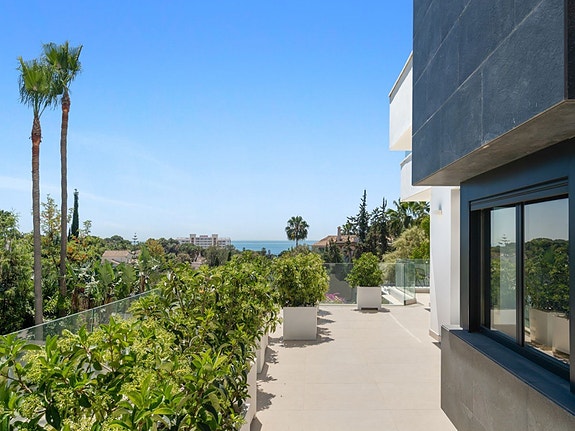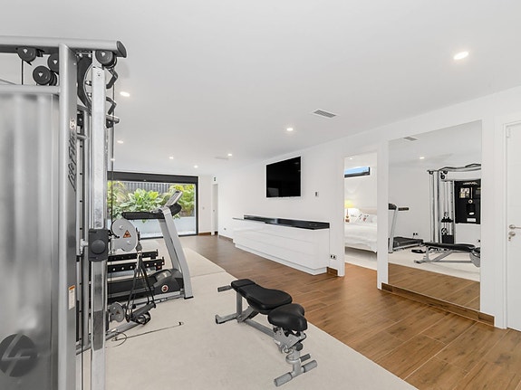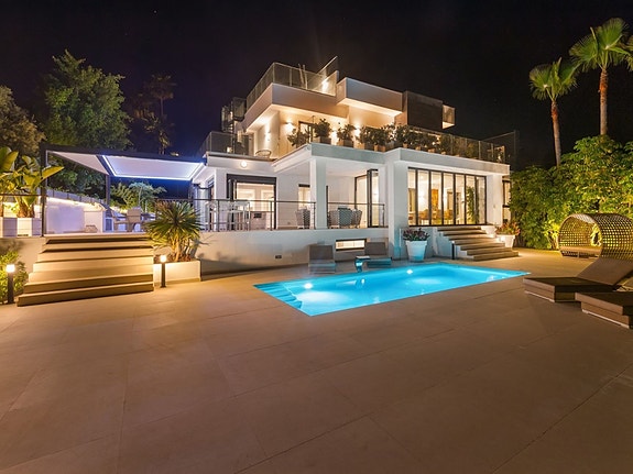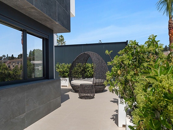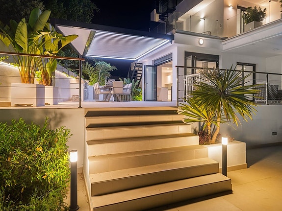 Herfra kan du gå gjennom et utvalg vakre tropiske planter til en utvendig trapp som fører til de øvre terrassene og takterrassen.Villaens sikkerhetssystemer er av høyeste kvalitet og tilgjengelig på smarttelefon: