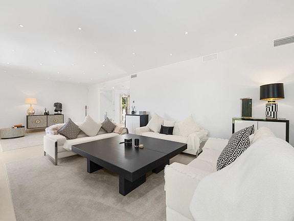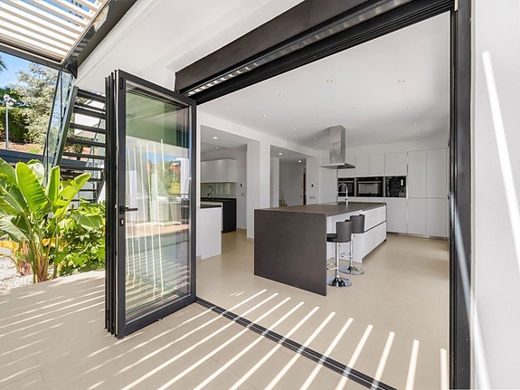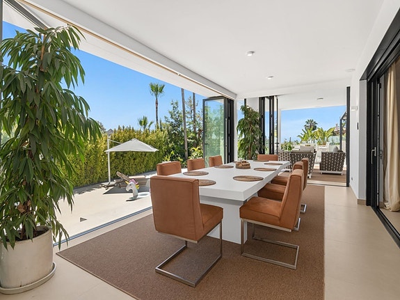 Doble skyve- og skjulte glassdører fører til en ekstra stor inne-ute spisestue ideell for middagsselskaper eller bare avslapping med venner og familie med utsikt over bassenget og terrassen.