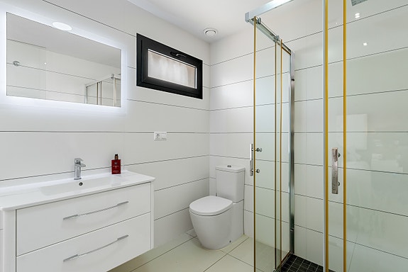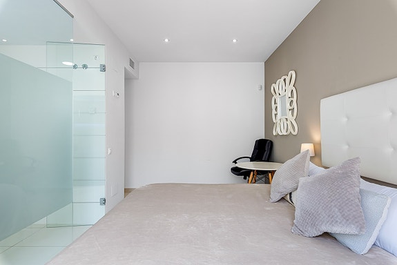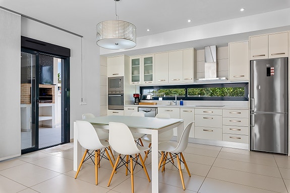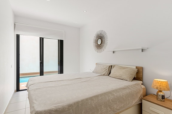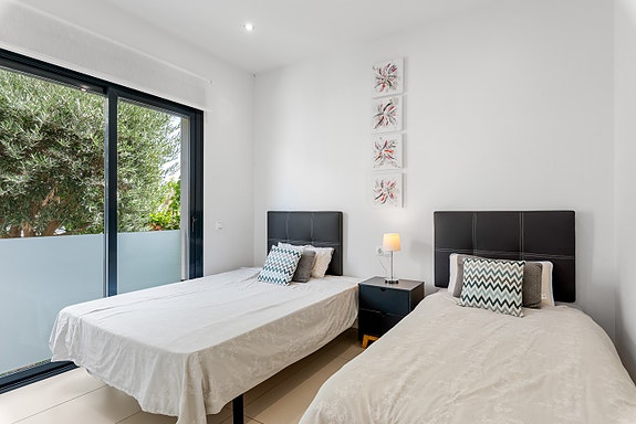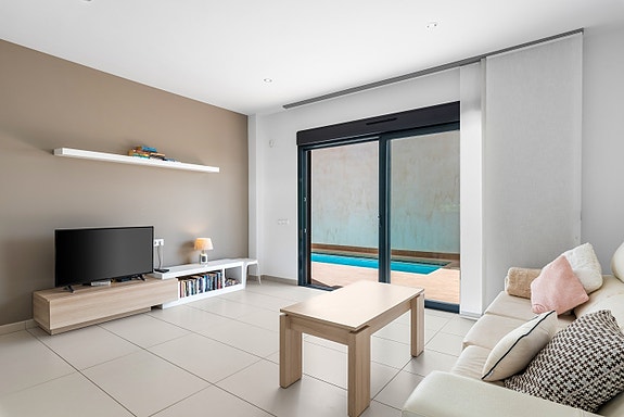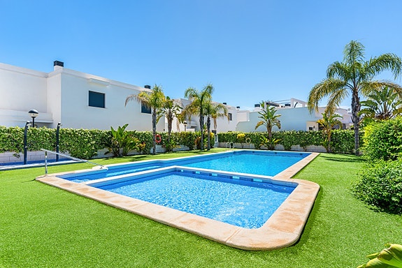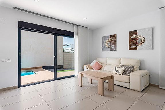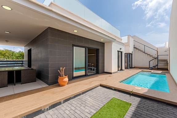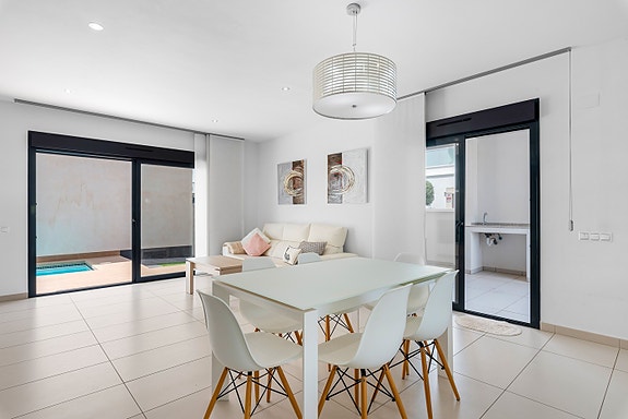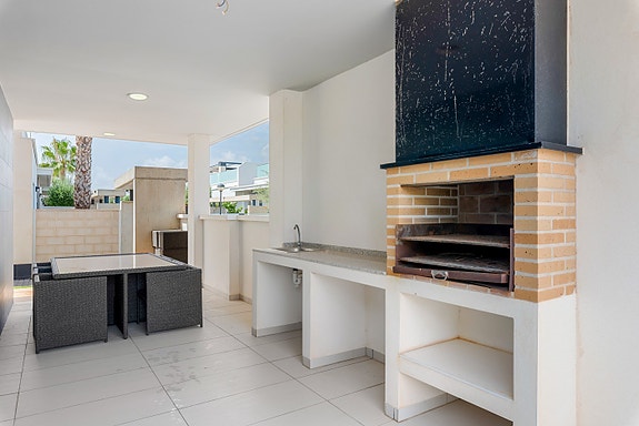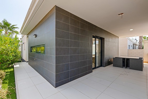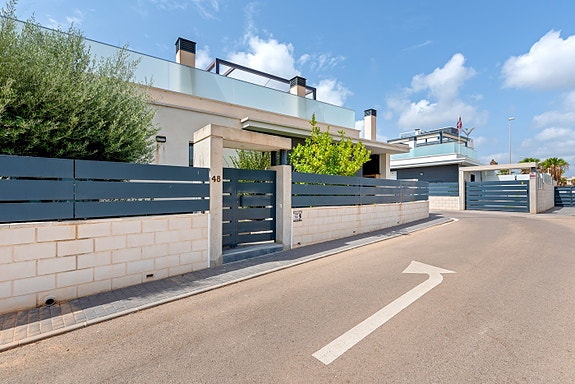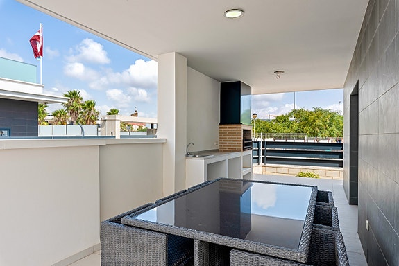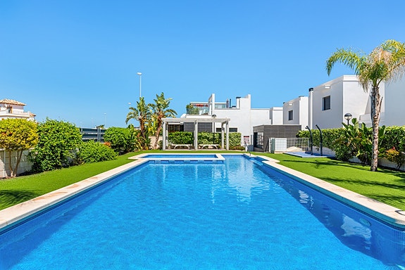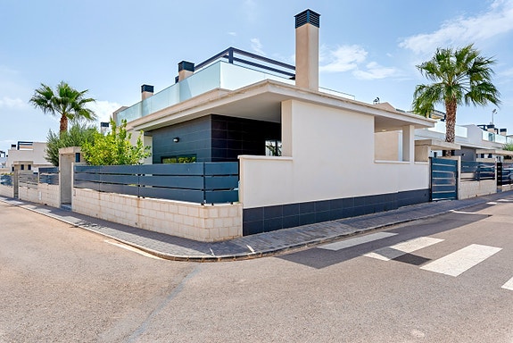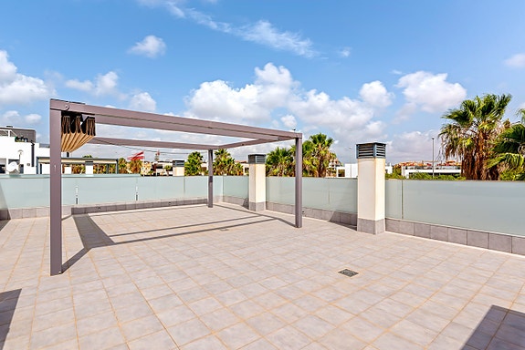 Spania1 har vi gleden av å presentere en moderne ettplans villa fra 2016 i Lomas de Cabo Roig. Dette er en hjørne bolig, noe som gjør boligen mer privat, og ikke minst mer luft når du er på den store takterrassen på 100 m2.Totalt inneholder boligen 3 soverom og 2 bad (hvorav et er en-suite). Det er parkeringsplass på egen tomt, det er privat basseng og en stor takterrasse. I tillegg til å ha eget basseng, har boligen tilgang til et fellesområde med grønn beplanting og et stort felles basseng.
