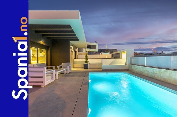 Villaen på ett plan som er avbildet i annonsen, har et areal på 113 m2 og består av en lys og romslig stue med dobbel takhøyde og en åpen kjøkkenløsning, tre store soverom med innebygde garderober og to bad, hvorav det ene er en suite med hovedsoverommet. Fra alle rommene er det direkte tilgang til terrassen og videre til den private svømmebassenget. Mot et ekstra gebyr har du muligheten til å inkludere en takterrasse via den utvendige trappen som er plassert på siden av boligen. Utbygger har brukt materialer av høyeste kvalitet, og det er en luksuriøs finish over hele boligen.- Enebolig