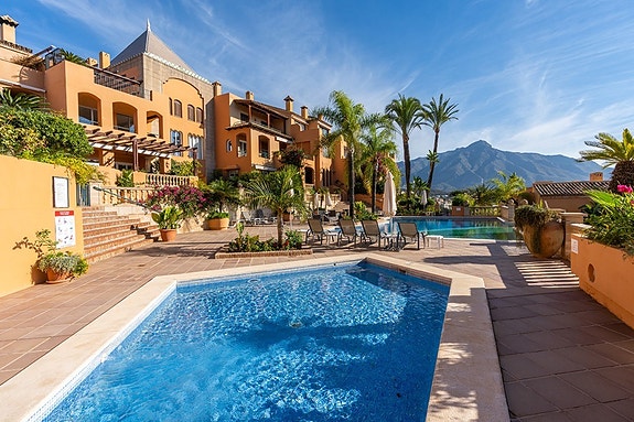 Dette idylliske leilighetskomplekset ligger i et rolig område i Nueva Andalucia. Nueva Andalucía er en velstående bydel som ligger like vest for Marbella sentrum, som er kjent for sitt eksklusive og luksuriøse preg.