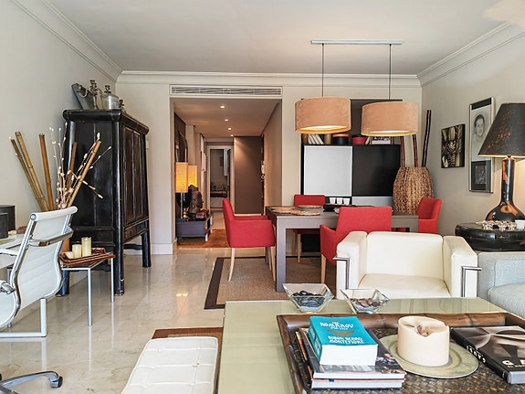 Denne klassisk sjarmfulle leiligheten bader i naturlig lys og presenterer et stue- og spiseområde som utstråler sjarm og varme, samt marmorgulv som tilfører hjemmet en tidløs eleganse.