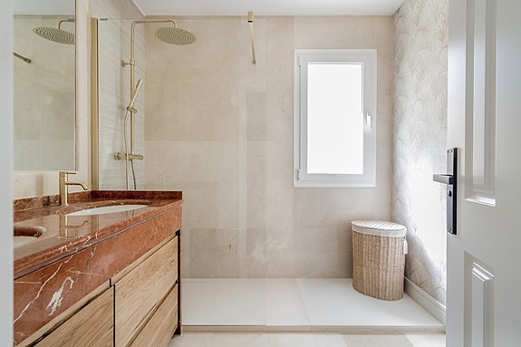 Leiligheten har 3 soverom (med mulighet for et 4. soverom eller et treningsområde) og 3 bad. Hovedsoverommet åpner ut mot hovedterrassen og har walk-in-garderobe og eget bad, mens de to andre deler bad og nordvendt terrasse. Badene har gulvvarme, og hovedbadet har separat dusj og badekar. Leilighetskomplekset tilbyr 24-timers vakthold med overvåkingskameraer og to svømmebassenger, hvor ett av dem er oppvarmet.