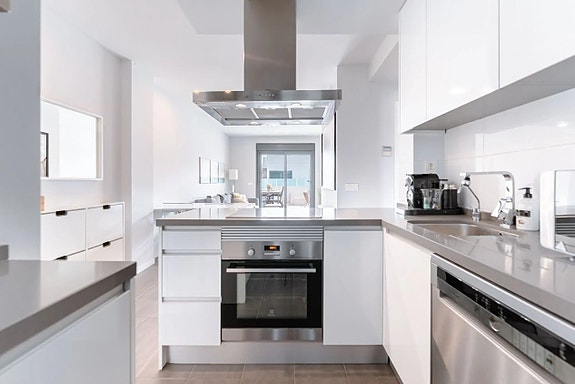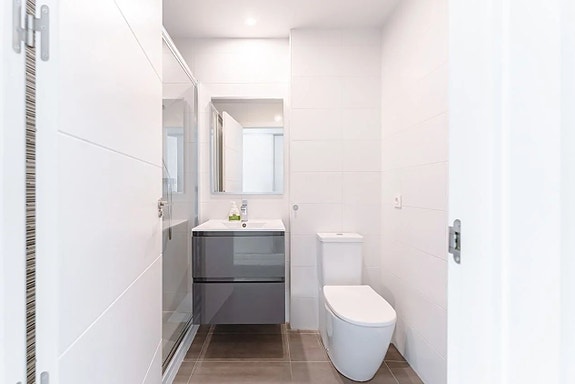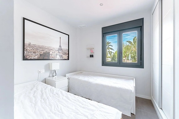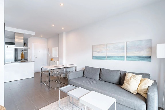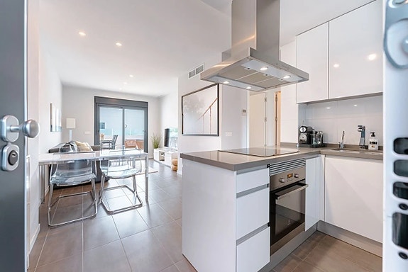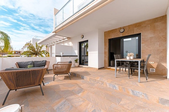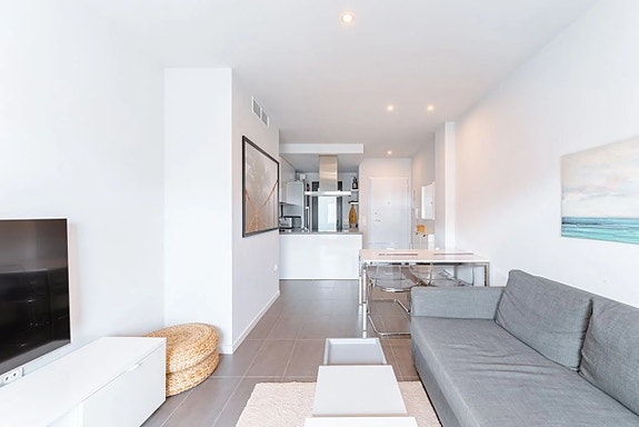 Den aktuelle leiligheten på bakkeplan ligger med inngang fra gaten med noen trappetrinn opp. Vel inne i boligen finner du en åpen planløsning mellom kjøkken og stue, som gir økt lys og harmoni. Kjøkkenet er moderne, med hvite fronter og fullt utstyrt med hvitevarer. Her er det også plass til spisebord. Rett ved kjøkkenet finner du en praktisk plass hvor det er vaskemaskin og varmtvannsbereder. Leilighetens to soverom er romslige og med innebygde garderober. Begge badene er moderne innredet, og har gulvvarme. Den fantastiske terrassen har adkomst fra stuen og har en perfekt sørøst-orientering og ligger kun et steinkast fra bassengområdet. Parkeringsplass følger også med.