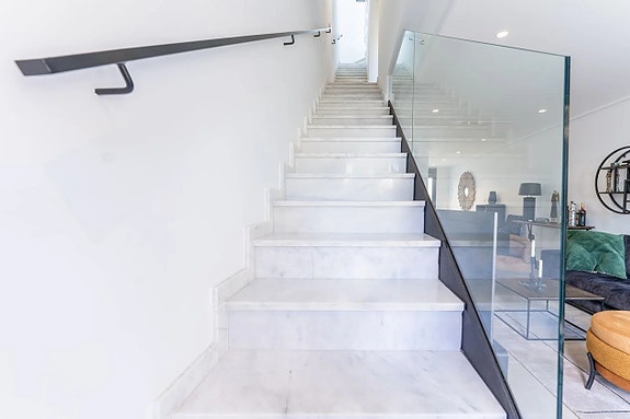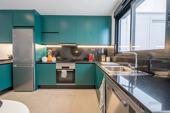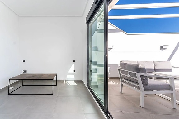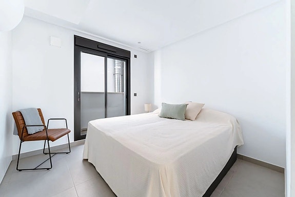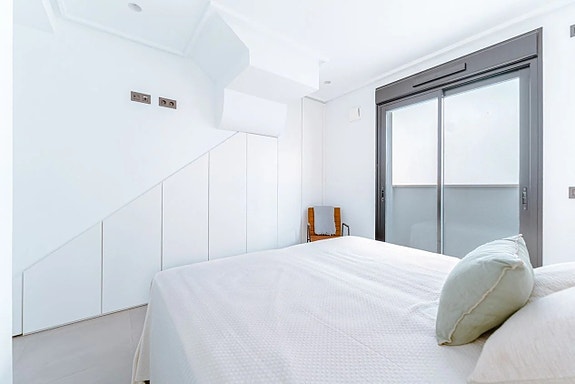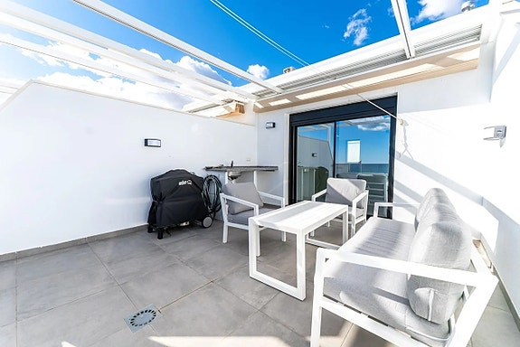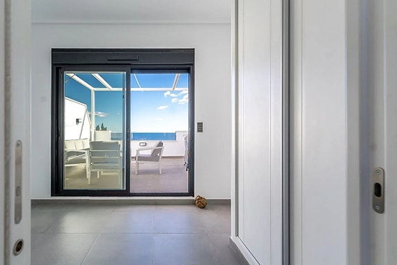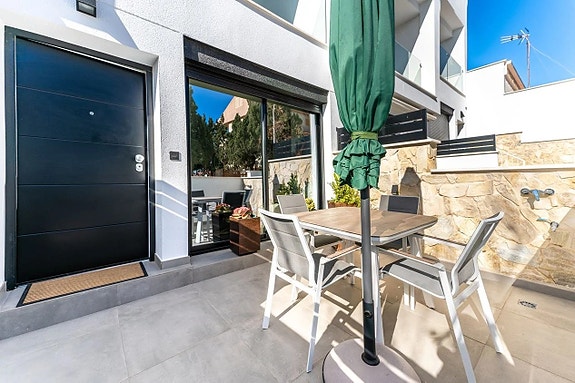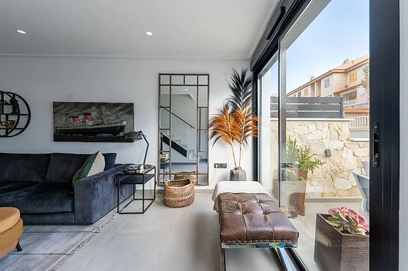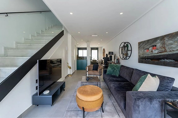 Noen få meter fra Middelhavet kan vi nå tilby deg dette fantastiske rekkehuset, bygget i 2022. Boligen er nesten helt ny og har et areal på 120 kvadratmeter fordelt over tre etasjer.På bakkeplan finner du en svært romslig og lys stue hvor du har et glimt av havet. Her finner du også et moderne og åpent kjøkken med direkte tilgang til en uteplass med rikelig med lagringsplass. På denne etasjen finner du også en gjestetoalett. Ved inngangen er det en koselig terrasse med østlig beliggenhet hvor du kan nyte morgensolen.