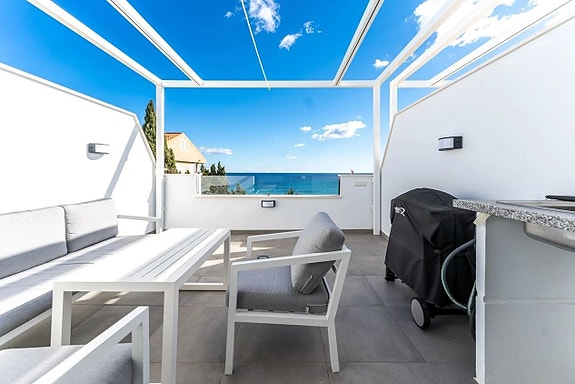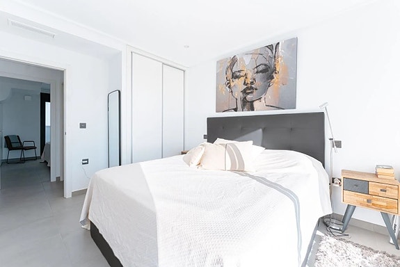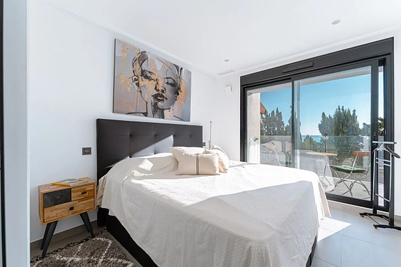 I andre etasje er det et tredje romslig soverom og et ekstra bad. Fra soverommet er det utgang til en romslig terrasse med god plass til et utekjøkken, solstoler og selvfølgelig fantastisk utsikt over Middelhavet. I denne etasjen har du også tilgang til fellesområdene hvor du kan nyte "infinity" basseng på en takterrasse med direkte utsikt over havet.