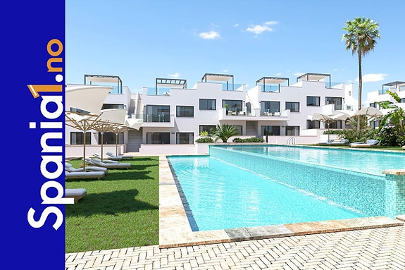 Spania1 har gleden av å presentere et fantastisk nytt boligprosjekt med "bungalow" leiligheter med 2 soverom og 2 bad, med mulighet for et tredje soverom. Leilighetene er bygget med materialer av høy kvalitet og med fantastisk utsikt over den rosa lagunen. Du kan velge mellom leiligheter i første etasje med romslig hage og leiligheter i øverste etasje med balkong og egen takterrasse. Komplekset har et stort felles hageområde, et svømmebasseng med utsikt over lagunen og en lekeplass. Parkeringsplass og bod mot tilleggspris.Om boligen