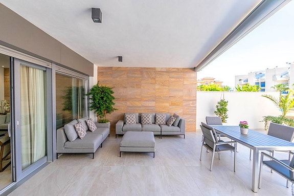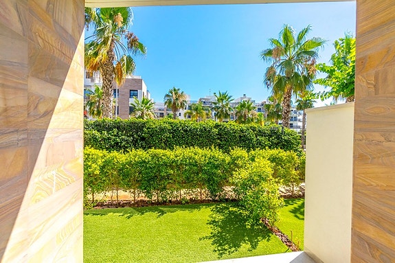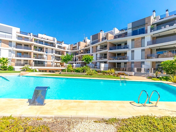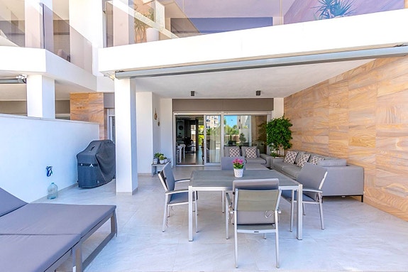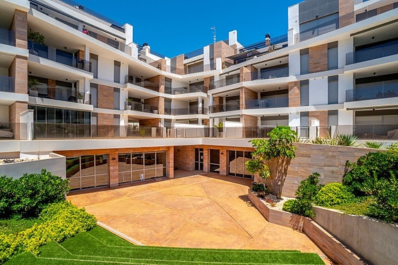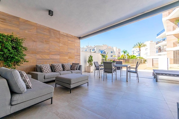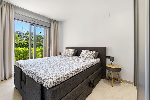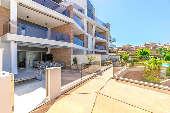 Spania1 har gleden av å presentere denne luksuriøse leiligheten på bakkeplan i det prestisjefylte komplekset Bioko Delux i Cabo Roig.Leiligheten består av en lys stue med åpen kjøkkenløsning, to romslige soverom med innebygde garderober og to bad, hvorav det ene er en-suite. Fra stuen og kjøkkenet når du en herlig terrasse på 55 m2 mot sørøst med god plass til solsenger, utemøbler og grill. Terrassen vender mot det felles svømmebassenget og det hyggelige grøntområdet. Fra hovedsoverommet fører en utgang til hagen på baksiden av leiligheten.