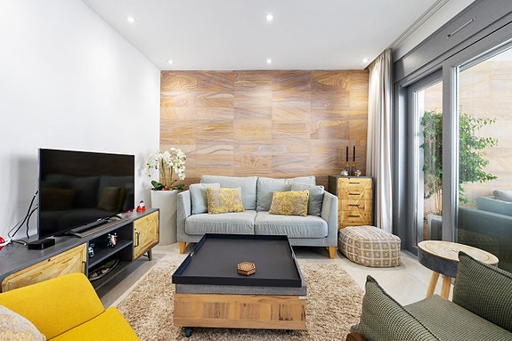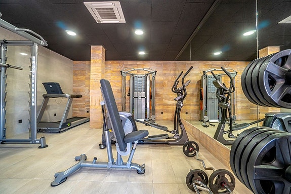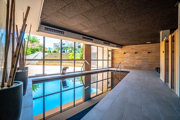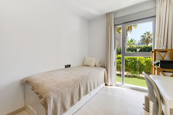 Leiligheten, som ligger i et lukket område, tilbyr en vakker og velholdt hage, treningsstudio, spa, innendørsbasseng, utendørsbasseng og private parkeringsplasser.