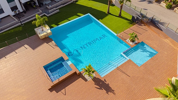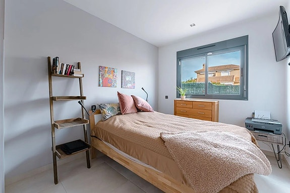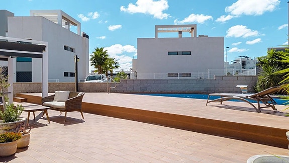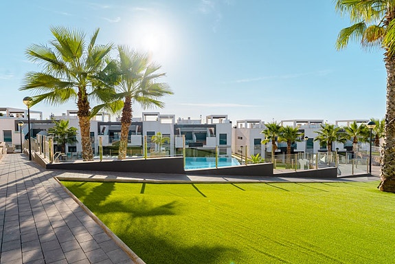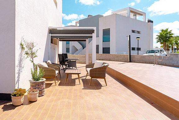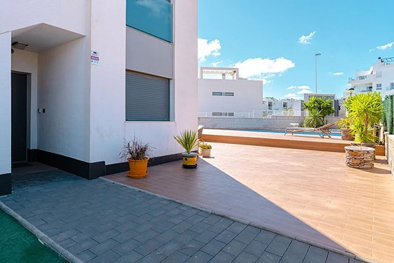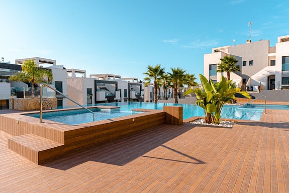 Leiligheten ligger på hjørnet og har en stor tomt med eget basseng. Den flotte uteplassen har godt plass til utemøbler og er et perfekt sted å samle familie og venner.