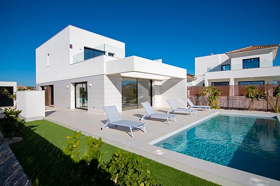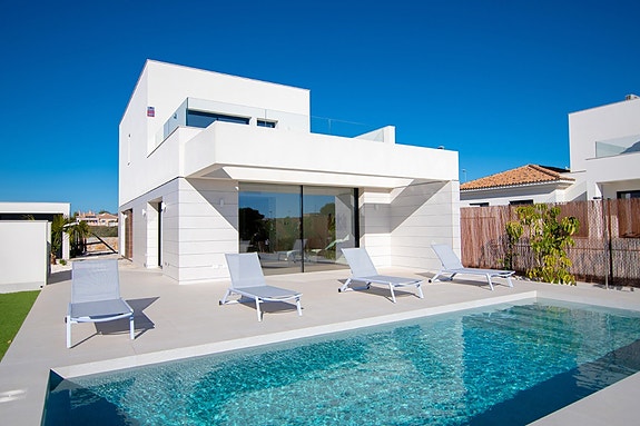 Spania1 har gleden av å presentere helt nye og luksuriøse villaer med 3 soverom og 3 bad. Her har du mulighet til å velge mellom to modeller, enten på to plan eller ett plan. Hver villa har et privat svømmebasseng, privat parkering, bod, utekjøkken og en stor uteplass.