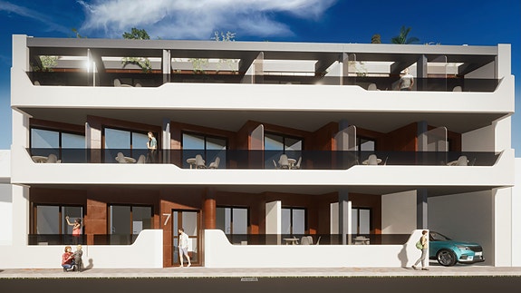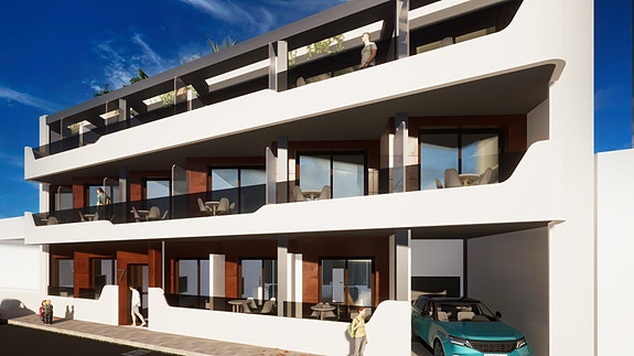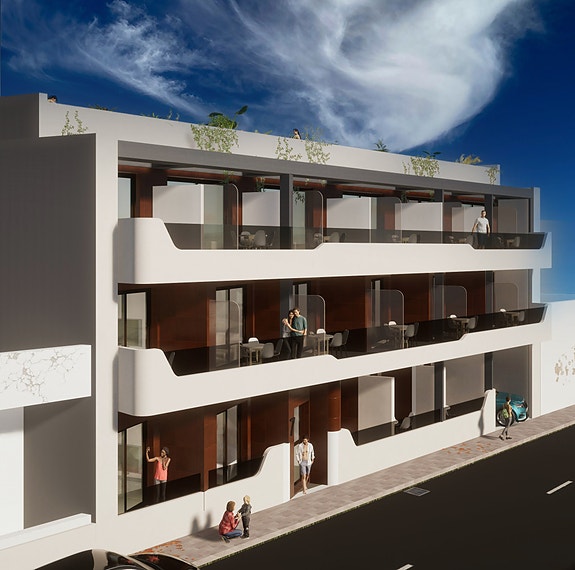 Nye moderne leiligheter med 2 eller3 soverom kun 200 meter fra Los Locos-stranden i den vakre kystbyen Torrevieja. Bygget går over 3 etasjer med mulighet for garasjeplass og bod i underetasjen.