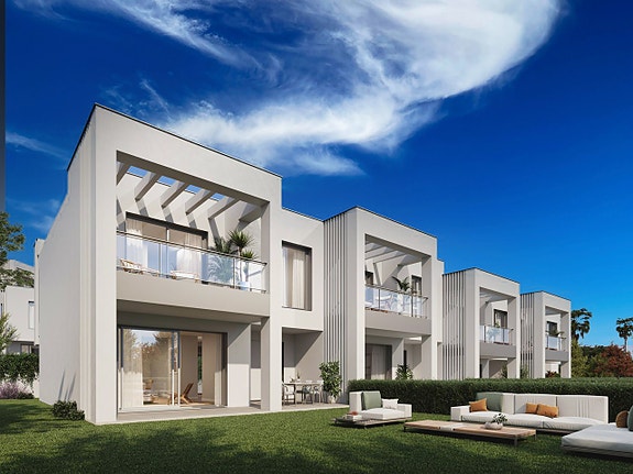 Nytt boligfelt med 52 rekkehus, hver med 3 eller 4 soverom over to nivåer. Alle boligene har en privat hage, overdekket terrasse, pergola og to parkeringsplasser. Stuene er romslige og åpne, med fullt utstyrt kjøkken med moderne apparater. 2 eller 3 bad, med hovedbadet som en-suite, og et gjestetoalett i tillegg. Alle enhetene har vannbåren gulvvarme, aircondition via aerotermi, doble vinduer og en utmerket planløsning. Det inngjerdede boligområdet har store grøntområder, et felles svømmebasseng, treningsstudio og co-working område.Om boligen