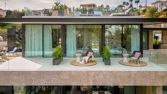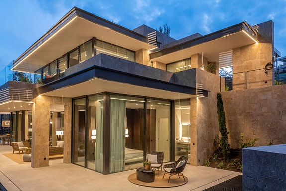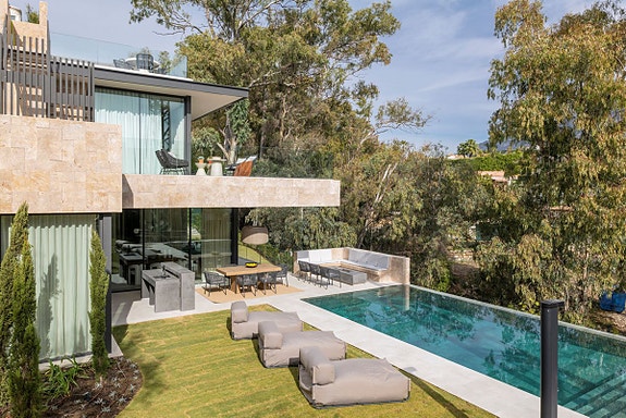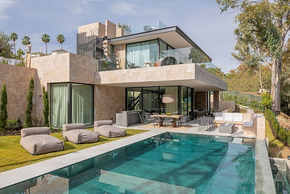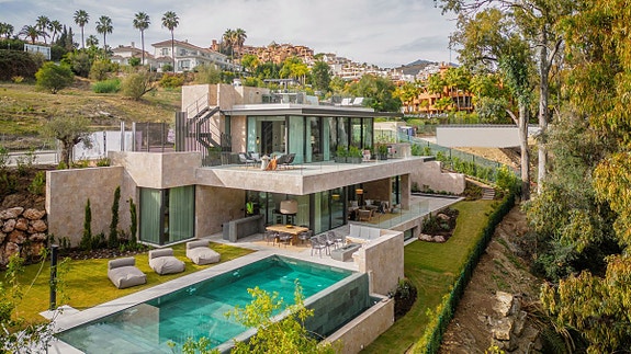 Spania1 har gleden av å presentere denne luksuriøse villaen med panoramautsikt over La Concha-fjellet. Villaen på 785 m² har 6 soverom, et lyst stueområde, et moderne kjøkken, og 6 bad. Rommene fører ut til store terrasser og hage med svømmebasseng. Takterrassen har grillområde med flott utsikt. Eiendommen har også ekstrafasiliteter som kino- og spillrom, et velværeområde med SPA, og garasje. Moderne fasiliteter inkluderer peis, heis, automatiseringssystem, air condition og doble vinduer.